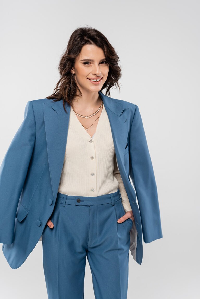 The Slate Ensemble features a tailored blazer and wide-leg trousers in soft blue, offering a modern yet classic look perfect for any formal setting.